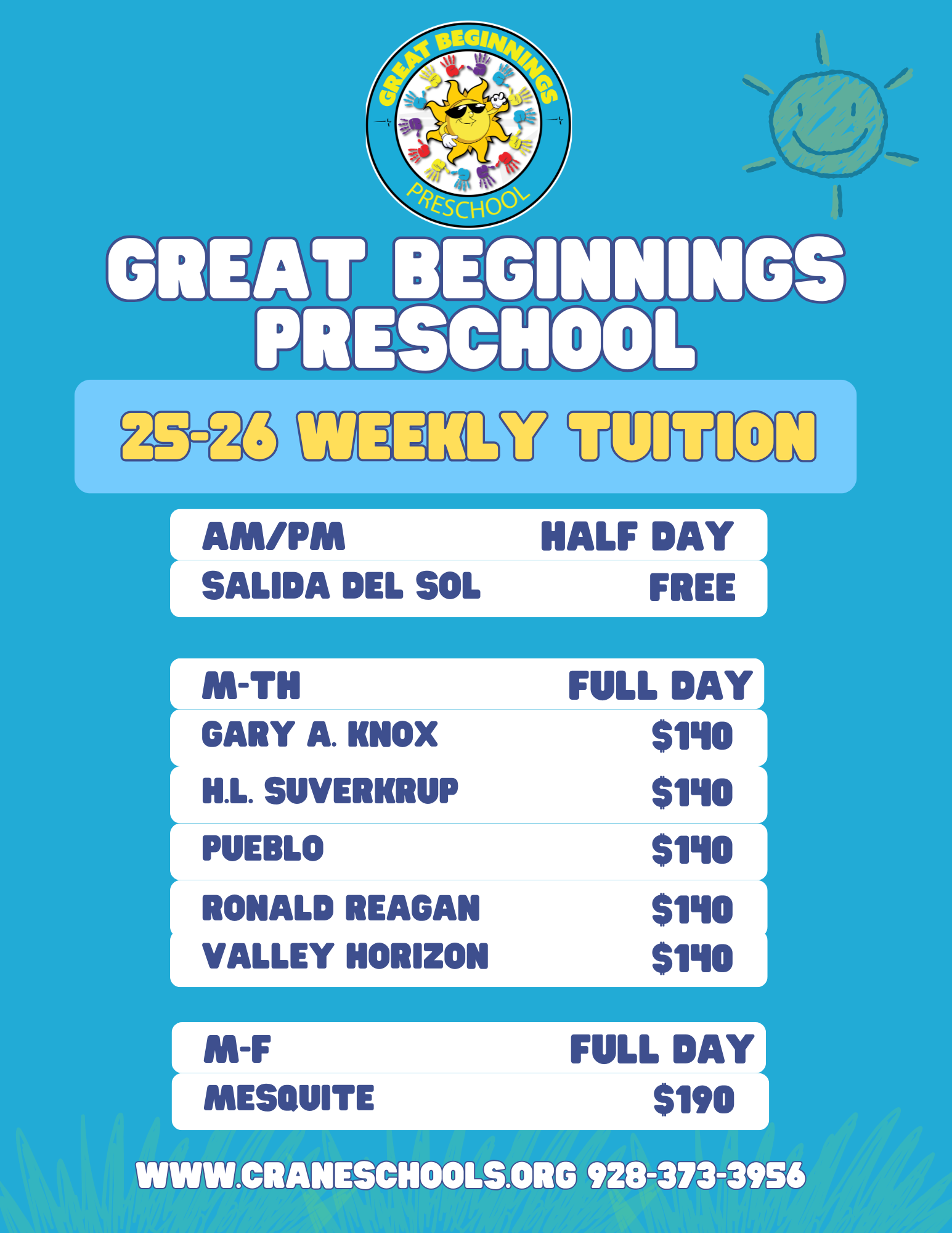 Crane also offers exceptional student preschool services to three and four-year old children. To determine whether a child qualifies for these services, please call the District Exceptional Student Services Department at (928) 373-3451.